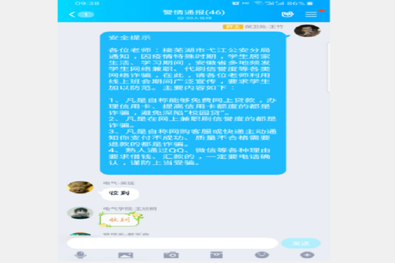 疫情期间,我省多地频发各类网络诈骗案件,涉案金额金额高达数十万元,对此,保卫处及时向全校师生员工发布安全提示。3月中旬,保卫处对接讯飞公司,利用“博思平台”线上网络教育、辅导员班级群,发布《防诈骗安全提示》,第一时间通报治安动态,要求辅导员召开线上班会,广泛宣传,倡导广大师生在抗击疫情的同时,增强防诈骗安全意识。通过以上举措,向全校师生宣传普及防骗知识和注意事项,全面做好疫情期间师生安全防控工作