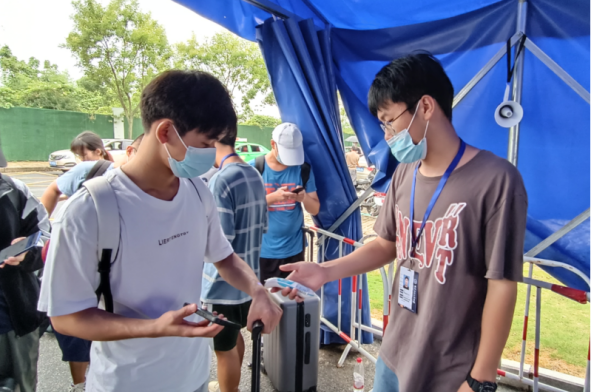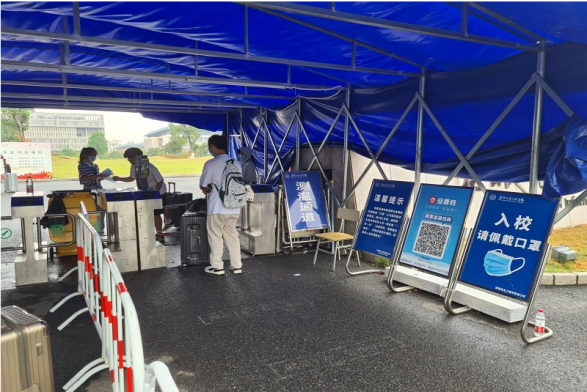 学生返校期间,作为校园疫情防控“守门人”,从清晨到深夜,学校保卫人员始终坚守一线、风雨无阻,仔细查验学生返校申请、健康码、行程码、48小时核酸检测报告,逐一检测体温,引导学生有序进校,协助学生运送大件行李,疏导校外交通。保卫处全体工作人员克服学生返校工作任务重、压力大等困难,与安保人员、校卫队志愿者各司其职,通力合作,以良好的精神风貌和务实的工作态度全面做好校园治安防控和突发事件的处置应对工作。