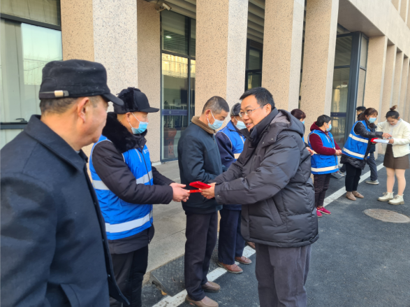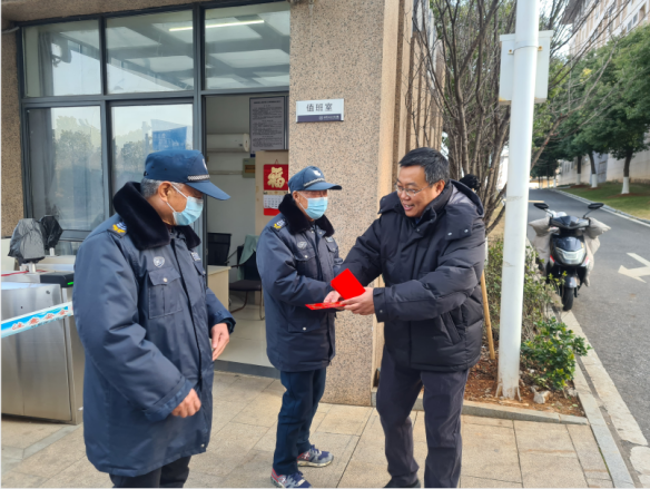 1月21日除夕上午,校党委委员、副校长汪忠国一行来校,走访慰问春节期间坚守一线的安保、物业工作人员,驻校警务站警员,向他们致以诚挚问候和新年祝福,学校保卫处、后勤管理处同志陪同慰问。