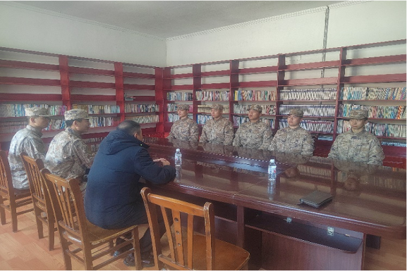 在连队会议室,营、连主官介绍连队光荣历史,对我校两名同志在部队的表现给予充分肯定,对学校为部队输送优质兵员并一如既往关心部队建设、千里回访共育英才表示衷心感谢。回访过程中与新兵召开专题座谈会,逐个了解其学习、训练、生活情况,代为转达家人视频嘱托,对个别思想有波动的新兵开展“一对一”谈心,稳定思想、化解矛盾。会后与新兵集体合影,勉励大家尽快转换角色、适应环境、安心服役,早日完成从一名大学生向合格军人的转变,在军营中磨砺意志,在锻炼中收获成长,在圆梦中彰显担当。全体新兵纷纷表示参军入伍是难得的人生机遇,一定不忘参军初心,牢记参军使命,谨记老师的谆谆教导和家人们的亲切叮咛,努力学习、刻苦训练,争当优秀士兵,用自己的实际行动为国防建设作贡献。最后,学校武装部还与连队领导、新训骨干建立联系,共同助力新兵成长成才。