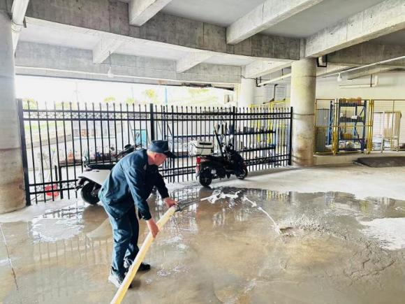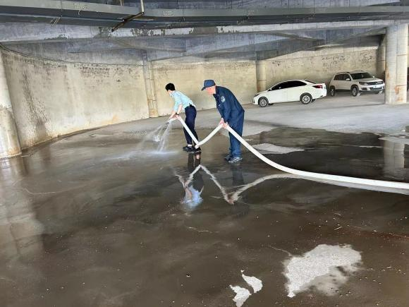 由于A11博艺楼地下室交付使用后未进行深层清扫,地面灰尘较重,安保人员通过借调水带进行拼接,在博艺楼内将水源引至地下室深度冲洗地面顽固污渍及浮尘,使地下车库焕然一新。
